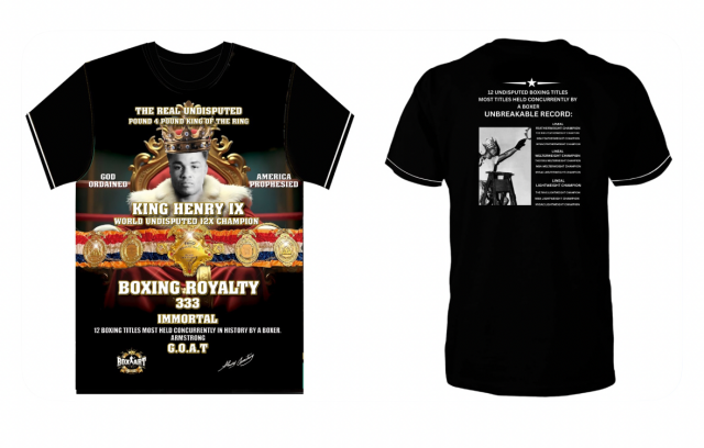 THE KING HENRY IX T-SHIRT-REPRESENTS THE HISTORY OF BOXING ICON-TRAILBLAZER HENRY ARMSTRONG'S UNDISPUTED WORLD CHAMPIONSHIP TITLES.